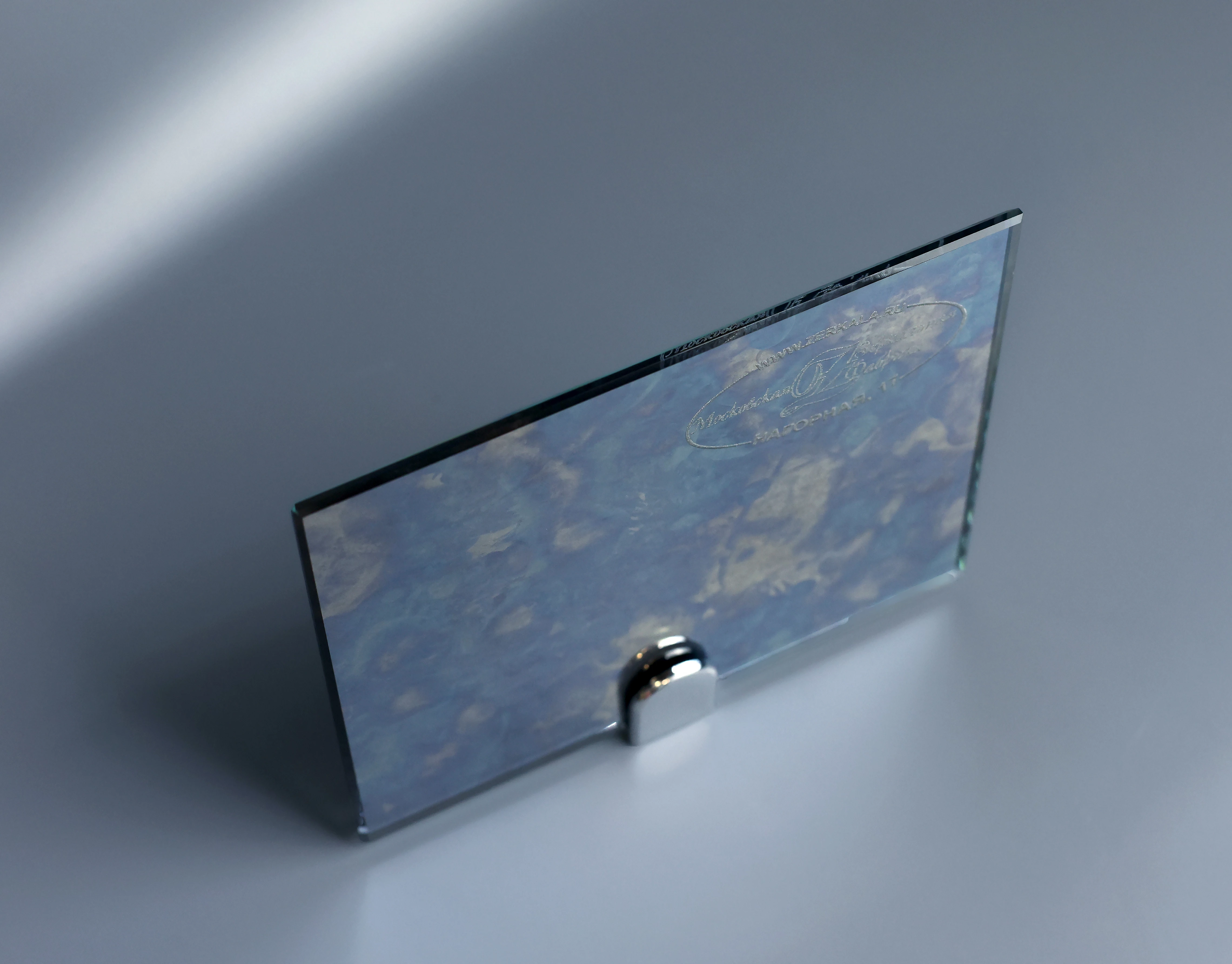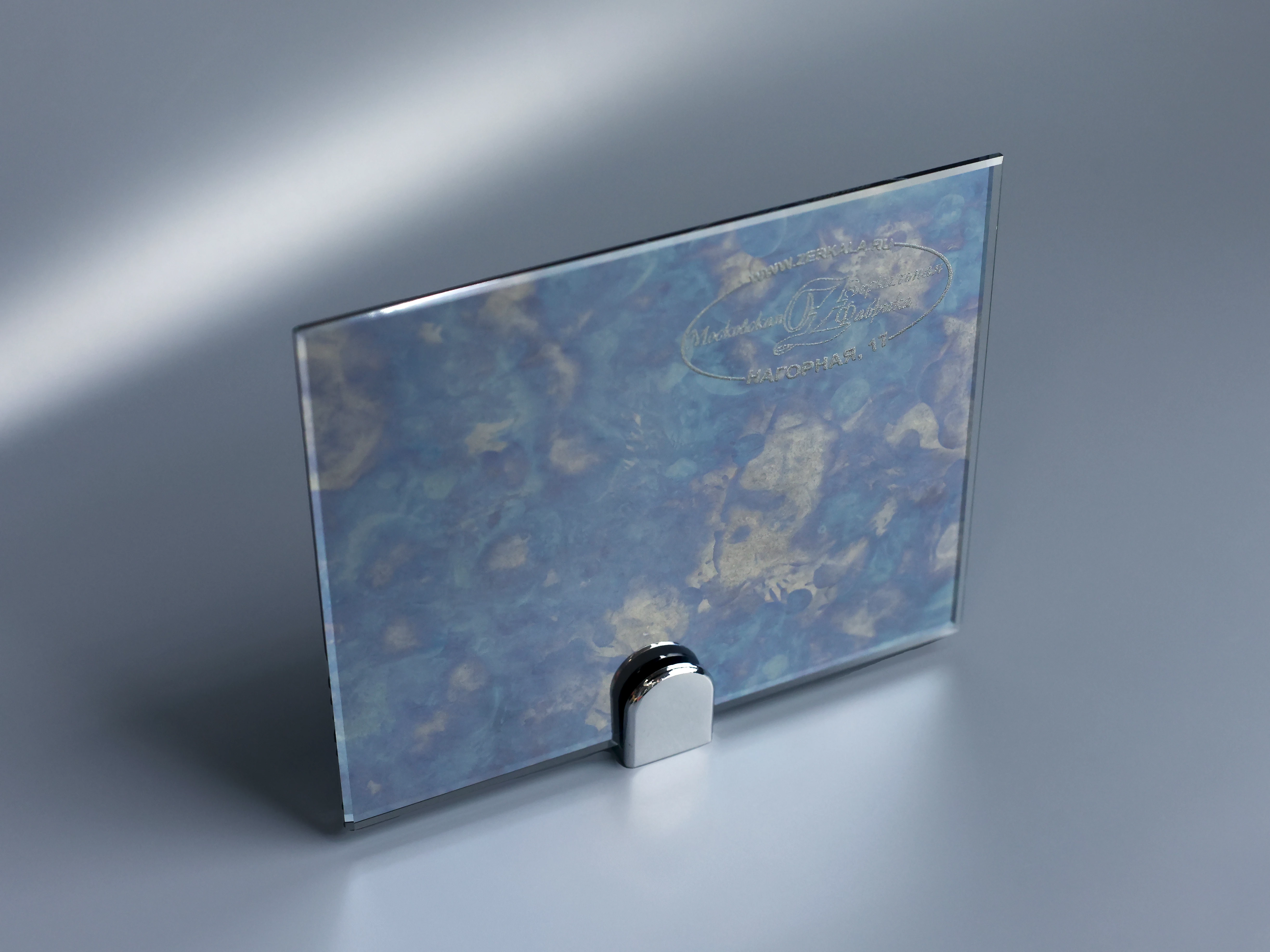 Игра света: благодаря неоднородности рисунка свет мягко рассеивается, создавая динамичные визуальные эффекты — при смене освещения зеркало выглядит по-разному, переливаясь оттенками синего и золотого.