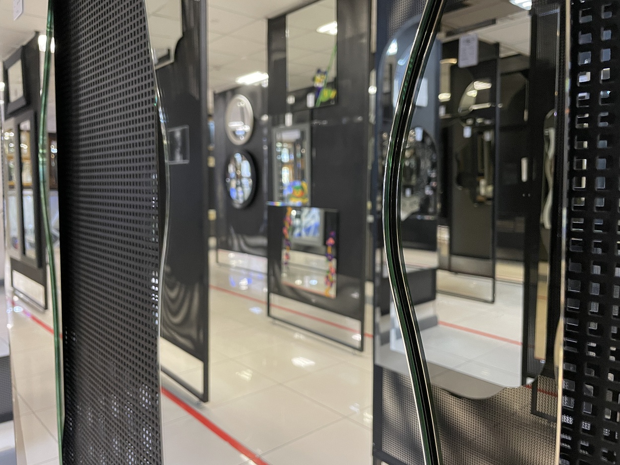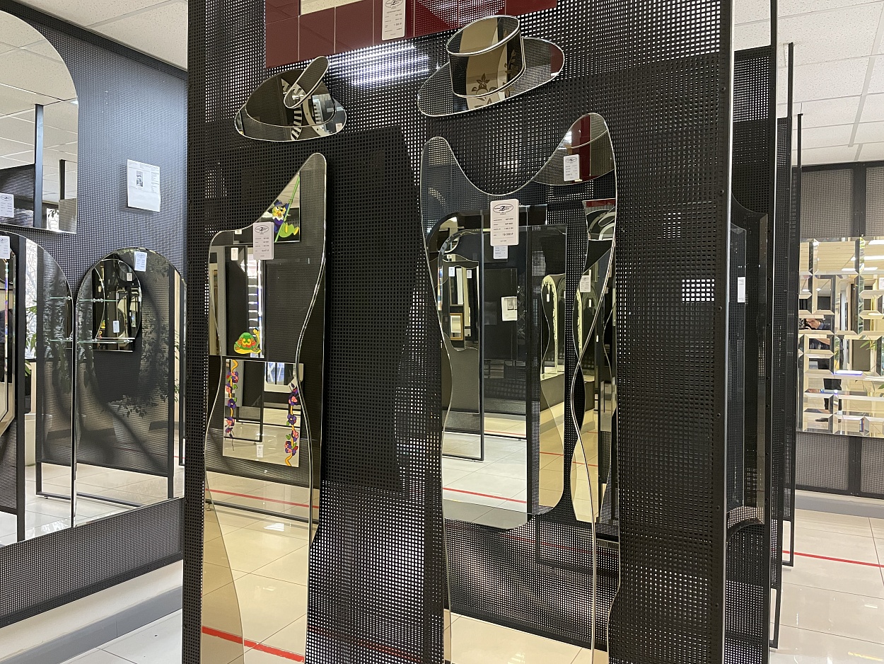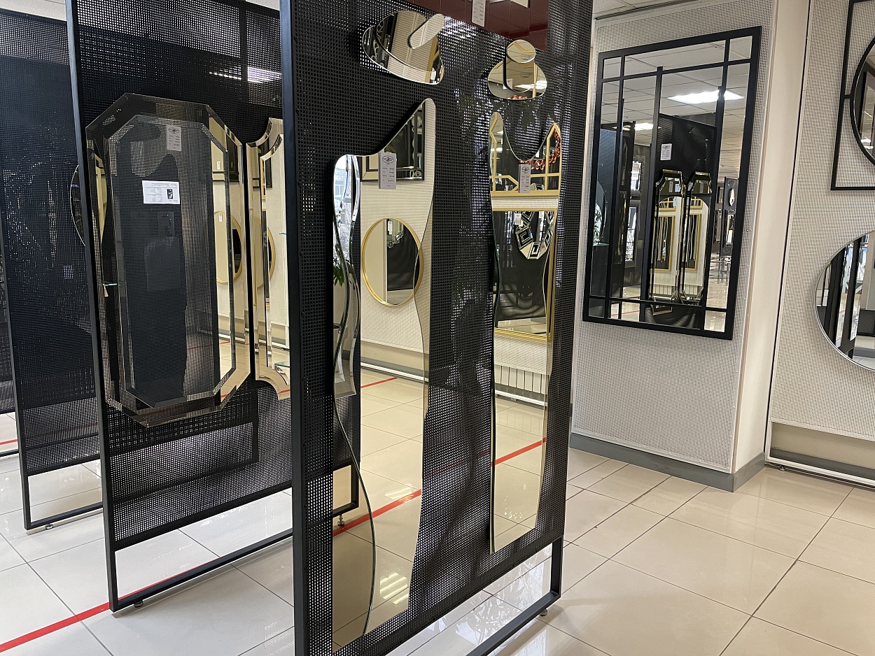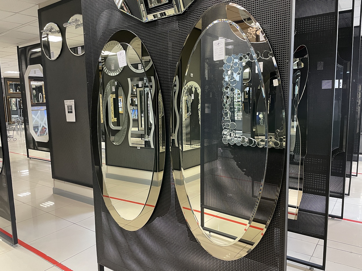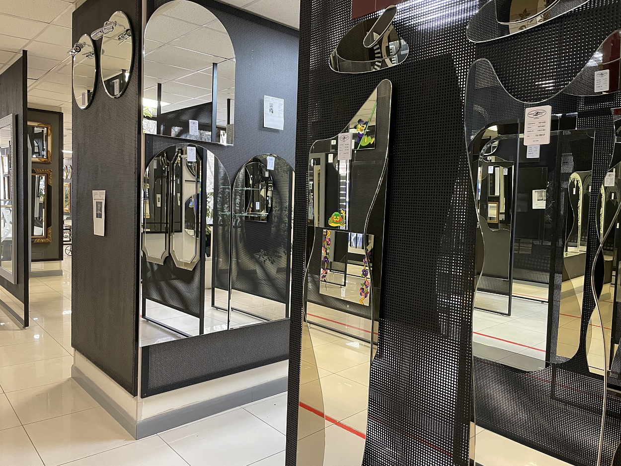 В выставочном зале на Нагорной 17 представлены готовые решения зеркал в разных дизайнах.