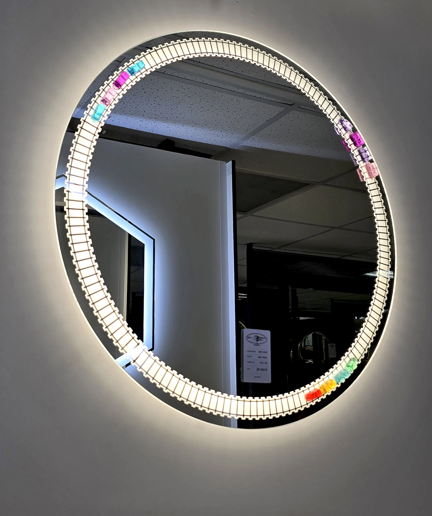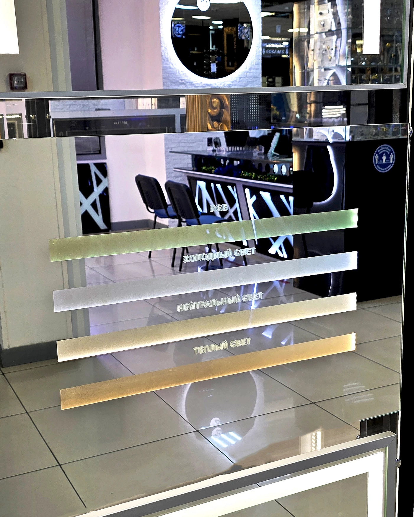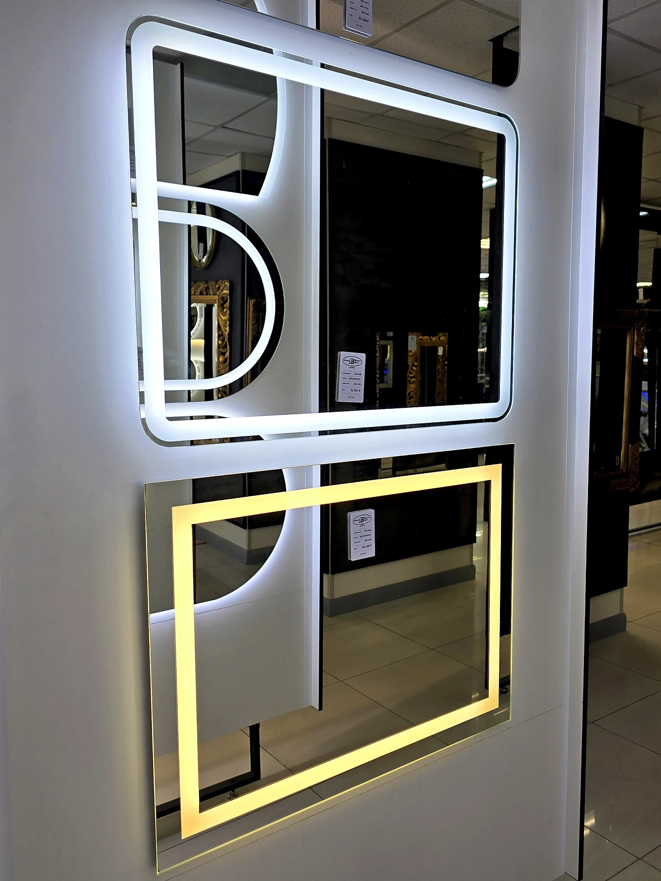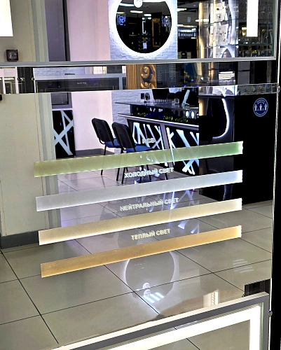 Диодные ленты для зеркал с подсветкой отличаются по тону. Они могут быть теплого, холодного, нейтрального тона, или RGB (разноцветные). Ваше зеркало с подсветкой может быть одного тона, или менять цвет по желанию, когда Вы используете элементы управления.