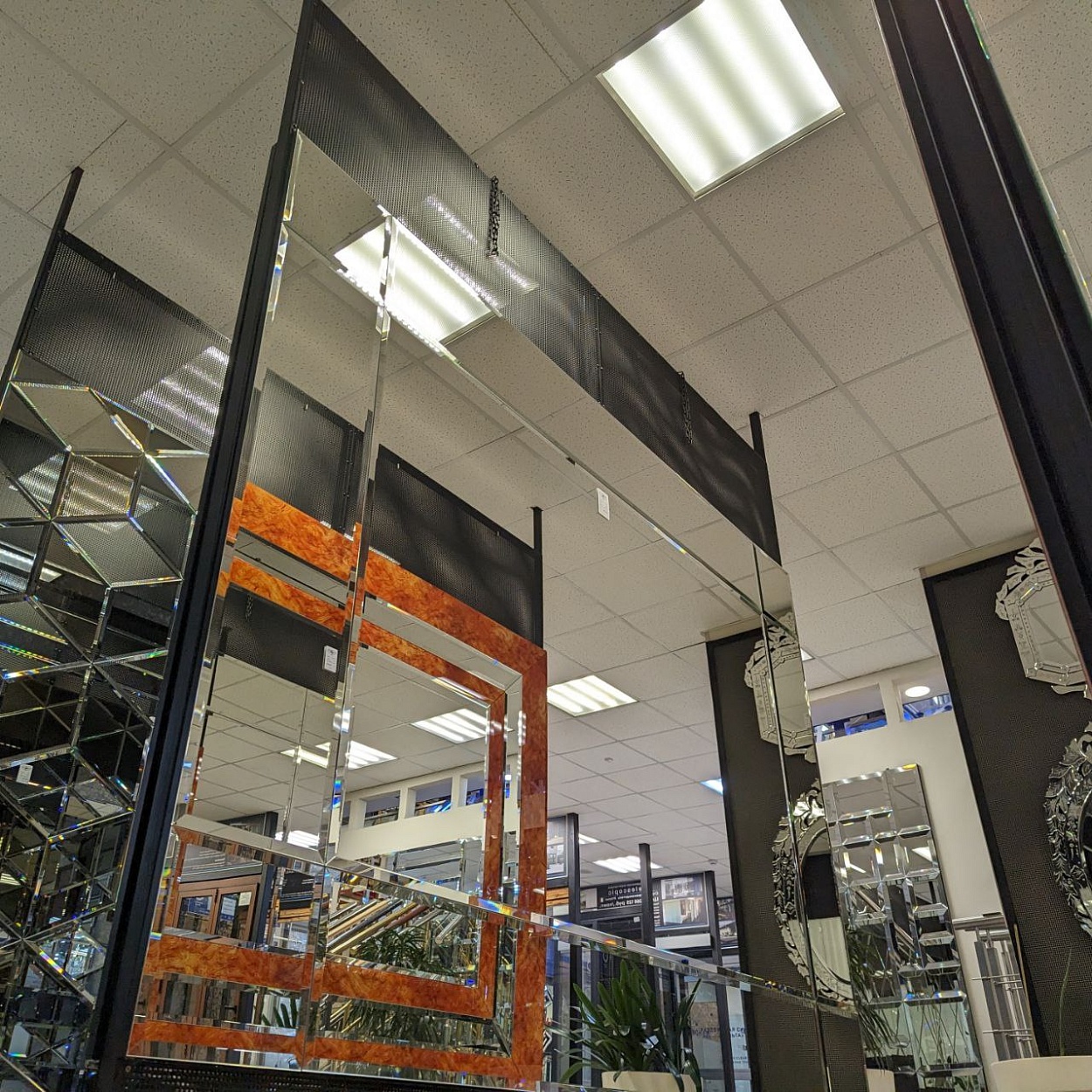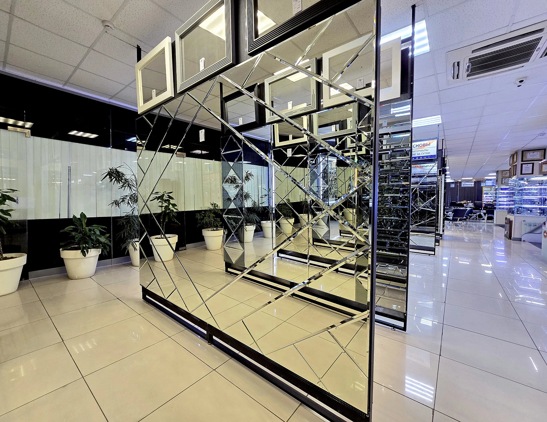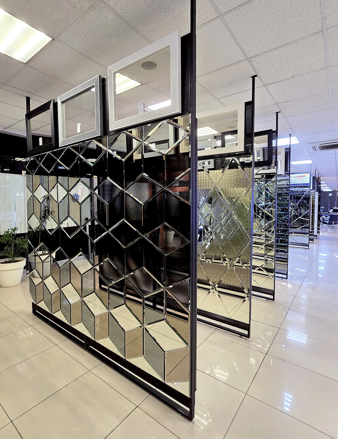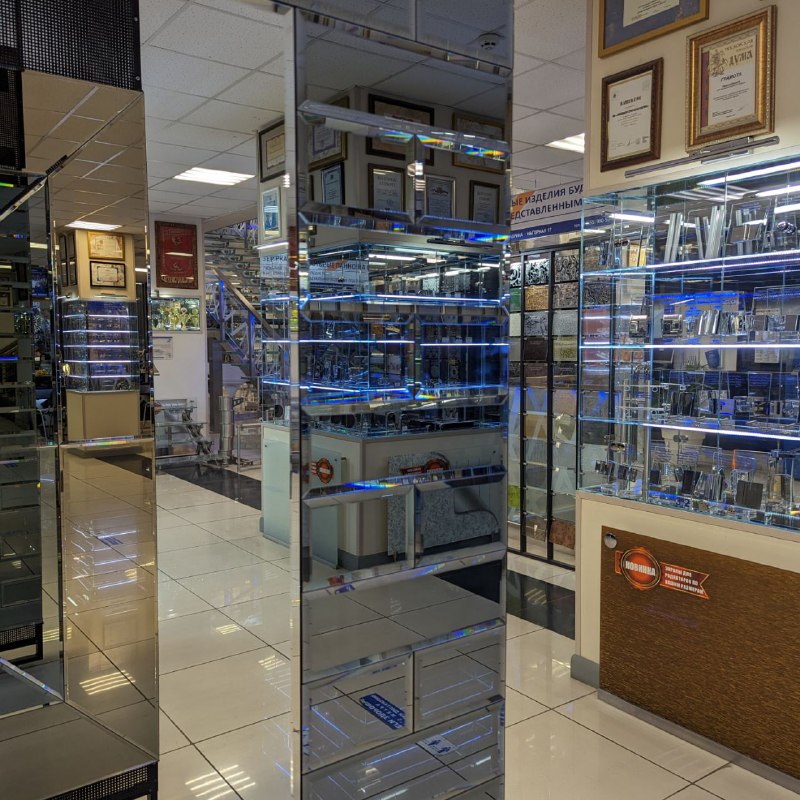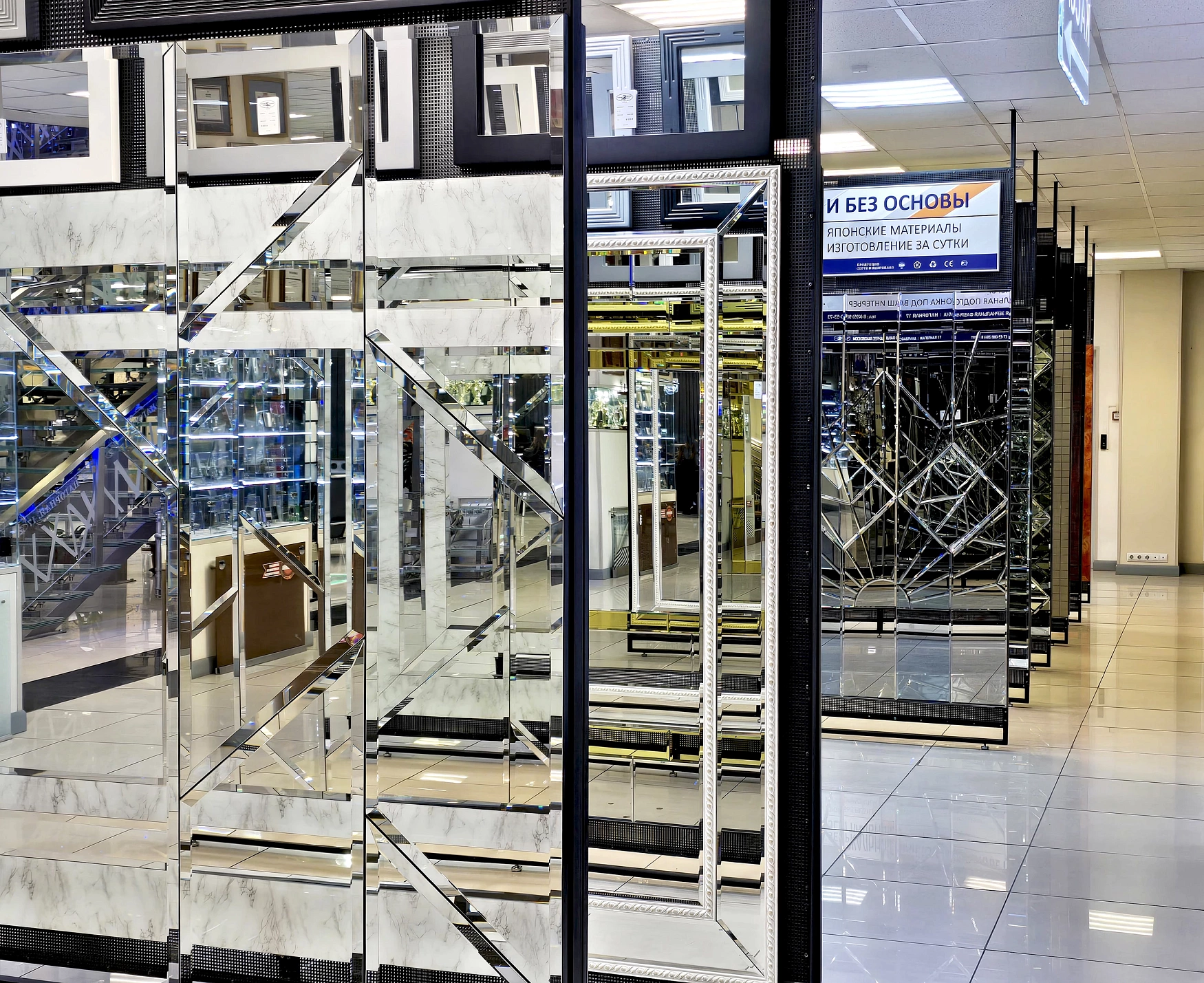 В выставочном зале на Нагорной 17 представлены готовые решения зеркал в разных дизайнах.
