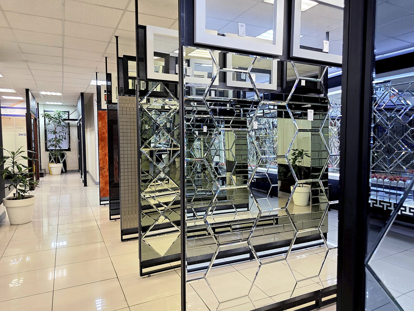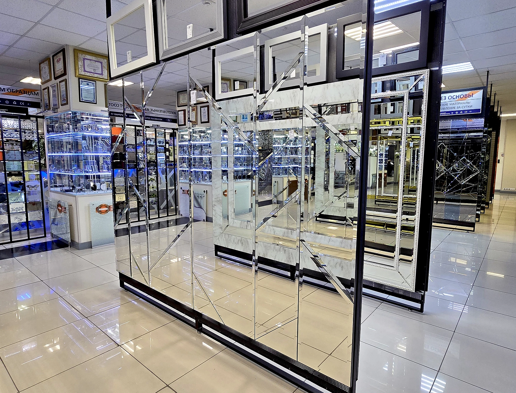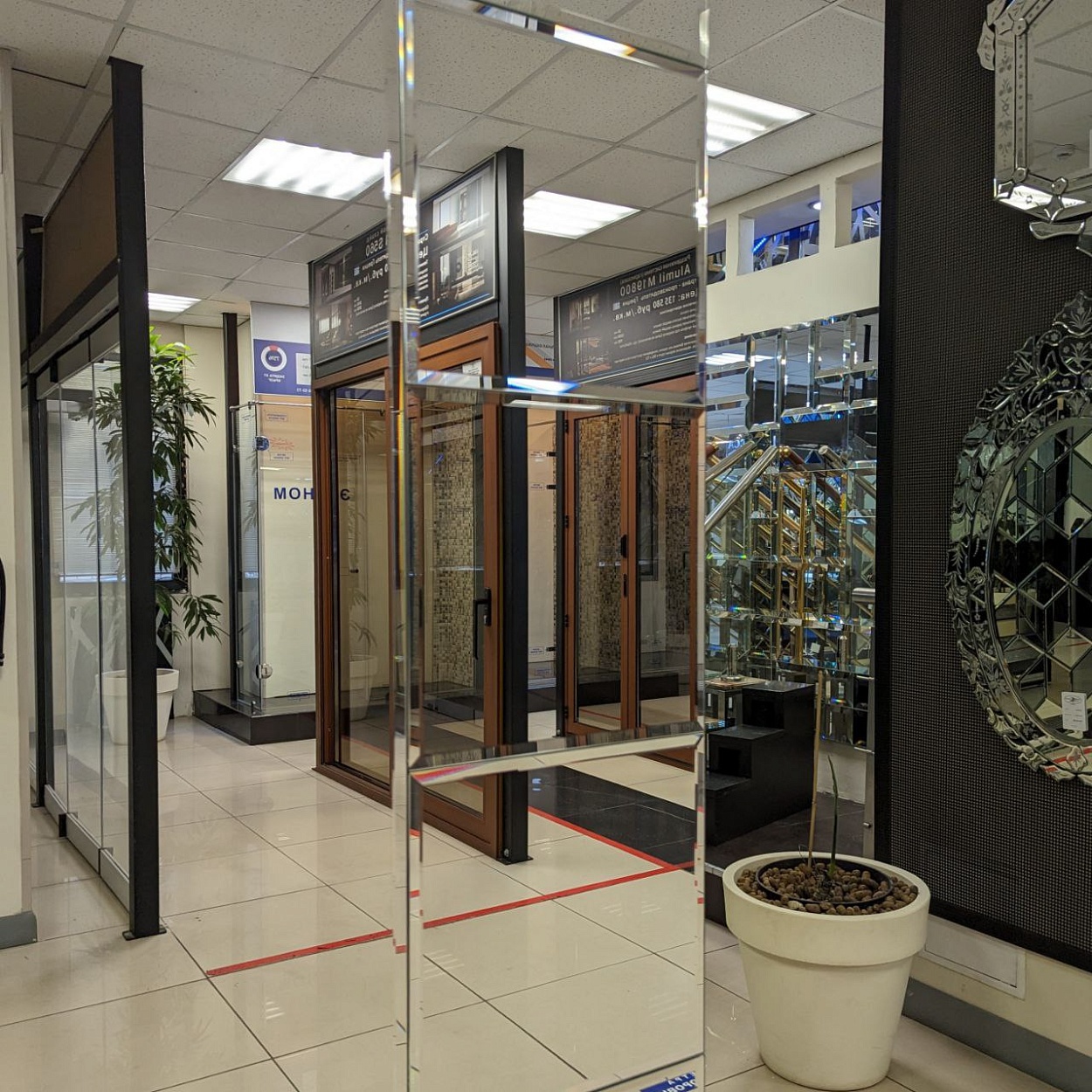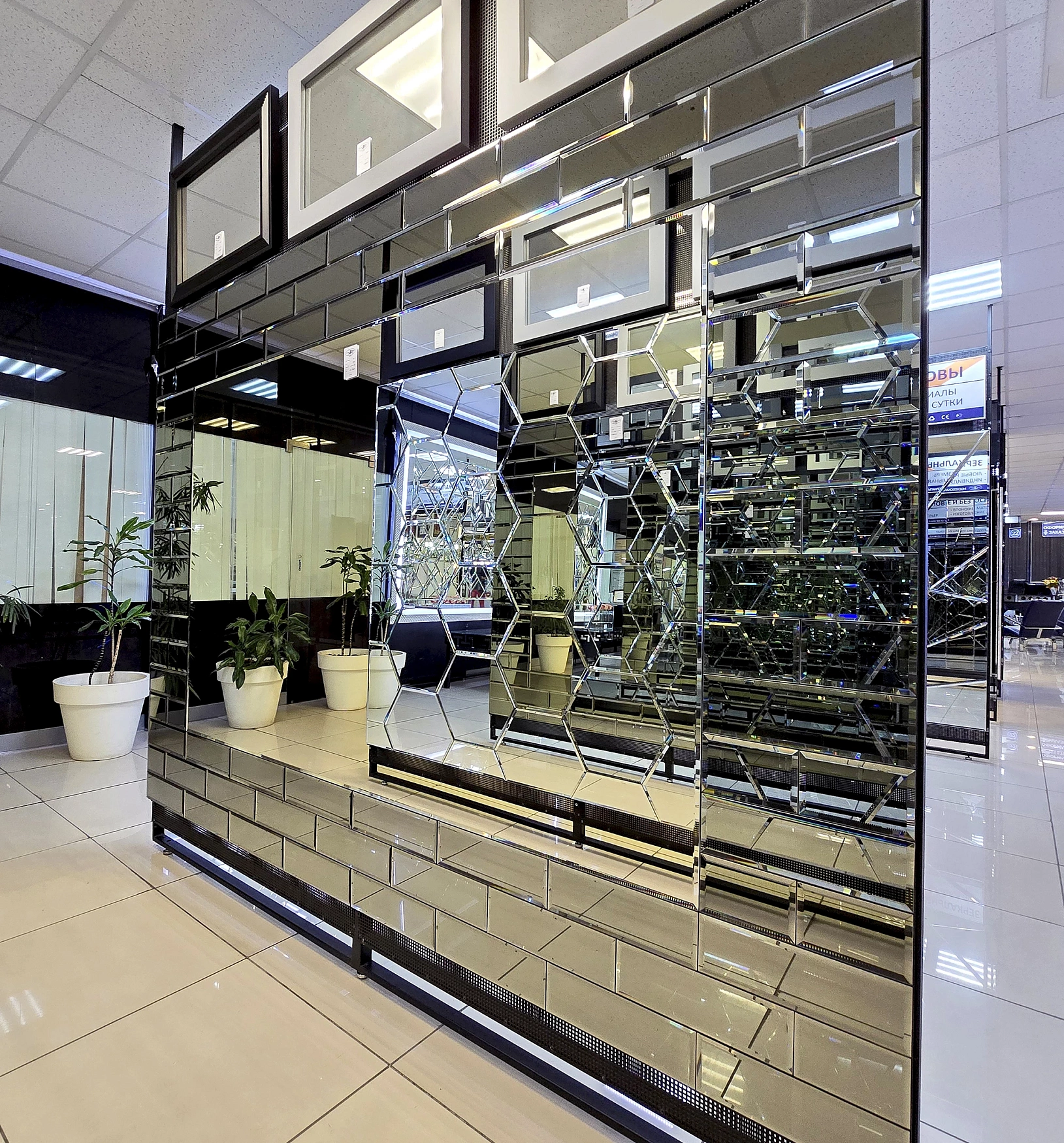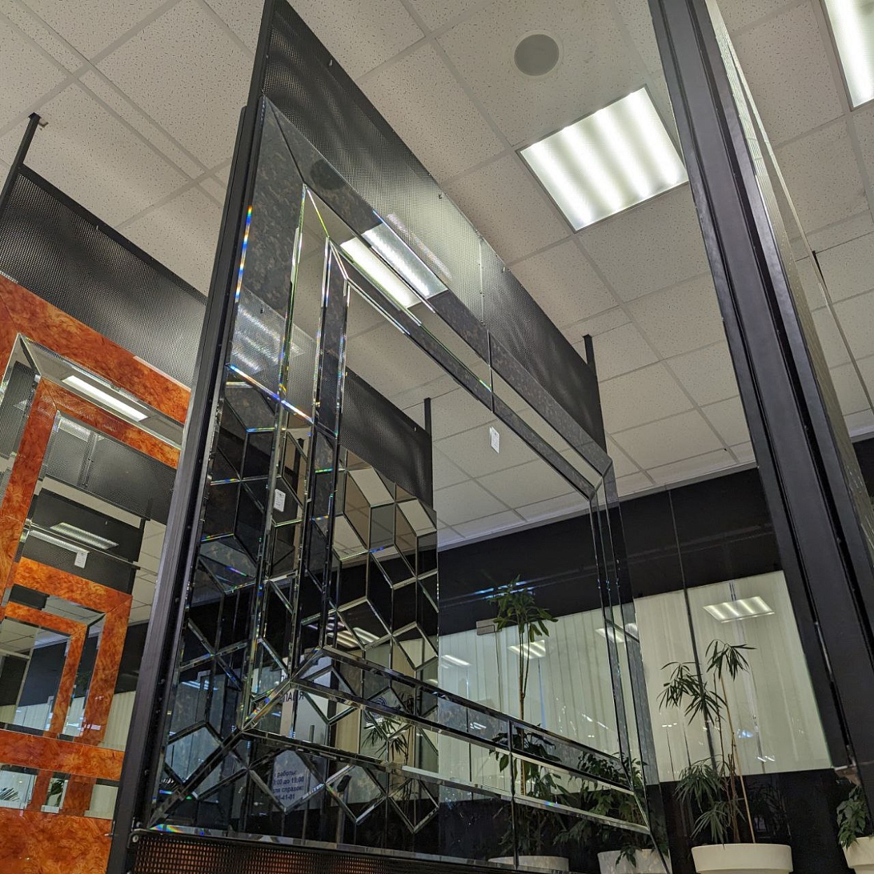 В выставочном зале на Нагорной 17 представлены готовые решения зеркал в разных дизайнах.
