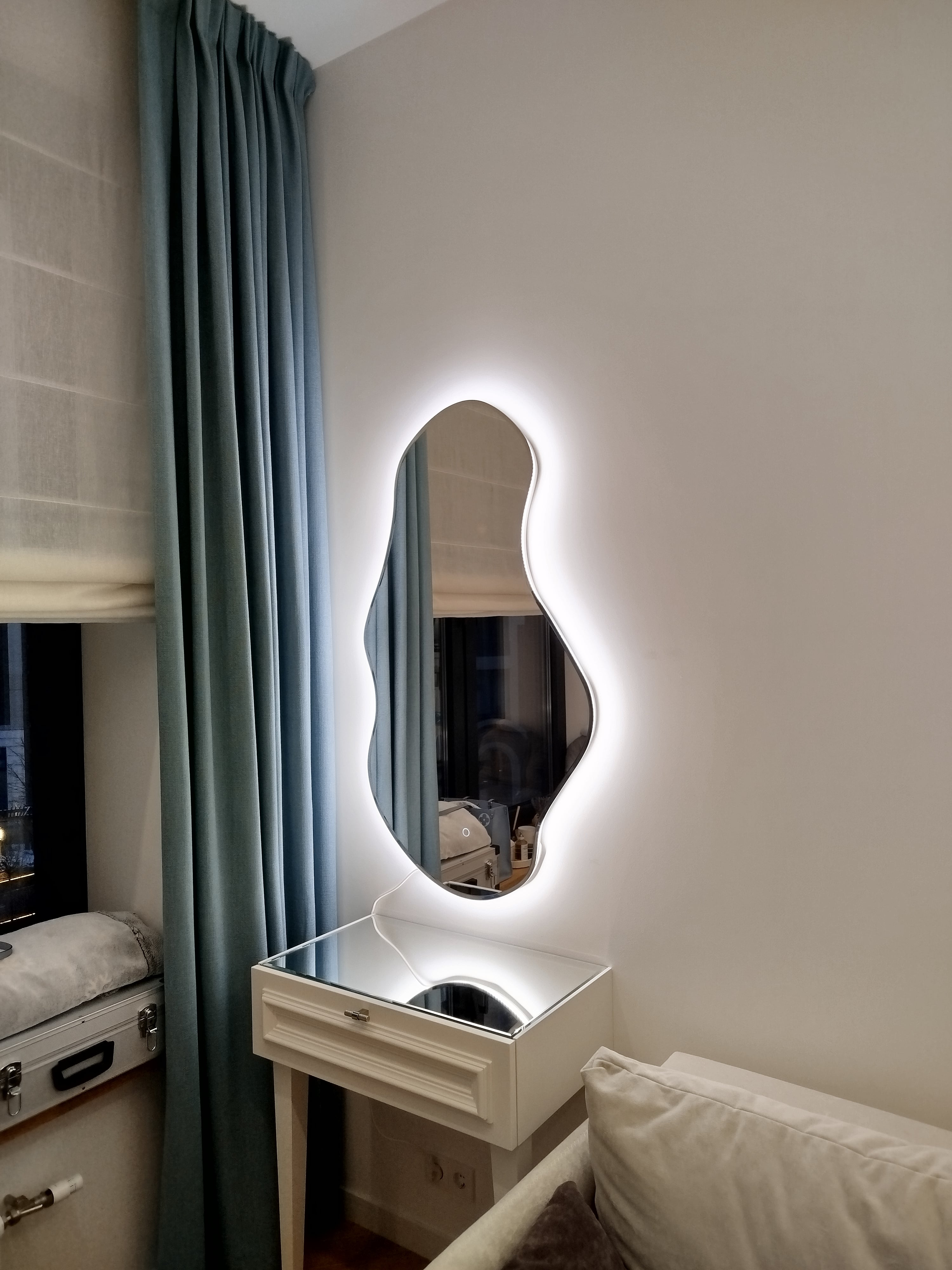 Несмотря на необычную форму, это зеркало очень универсально.  Вы можете разместить его в спальне, ванной и коридоре, и везде оно будет привлекать внимание. Благодарим клиента фабрики за фото и искренне восхищаемся его выбором.