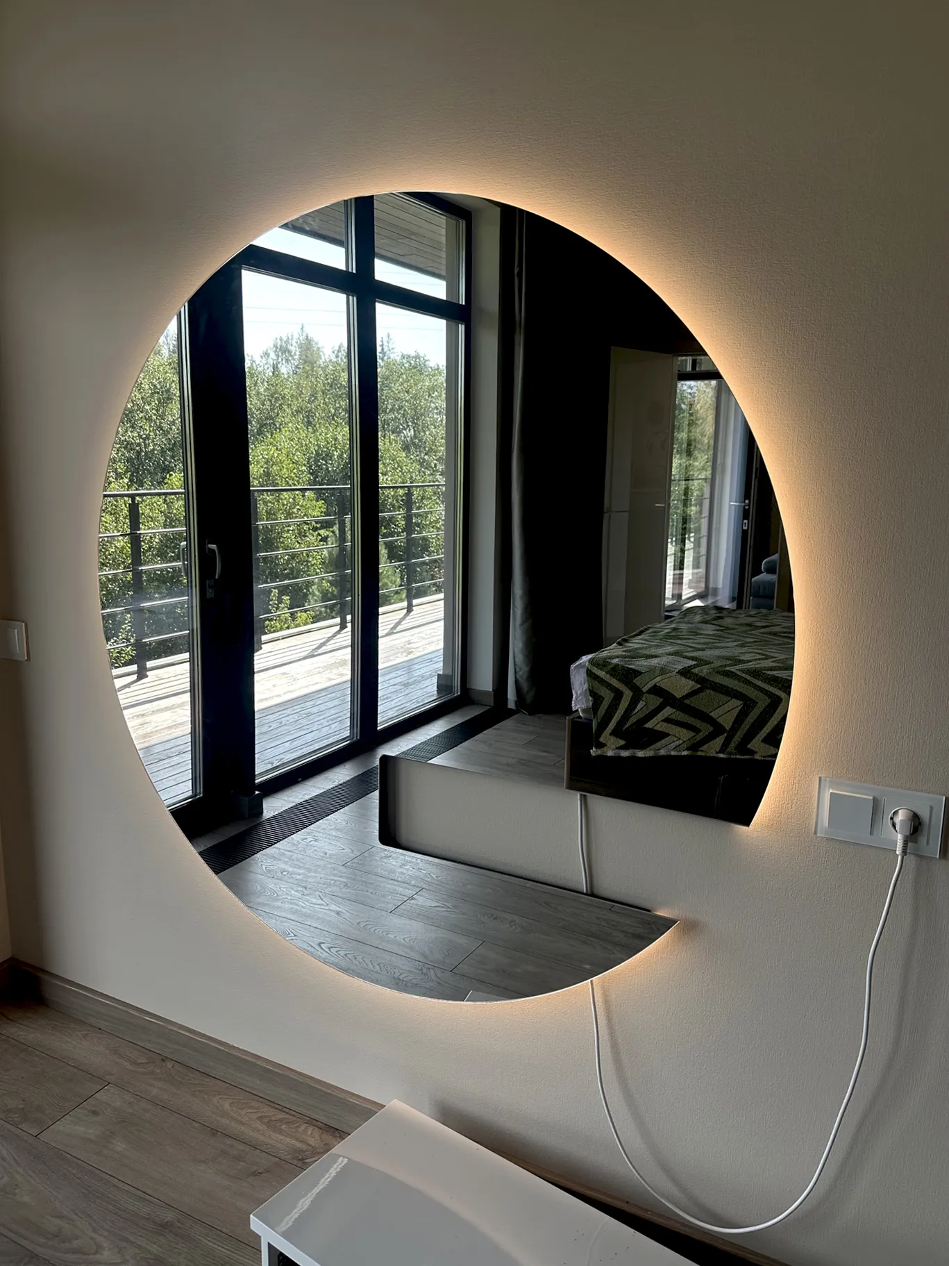 • Большое круглое зеркало с подсветкой с вырезом под полку