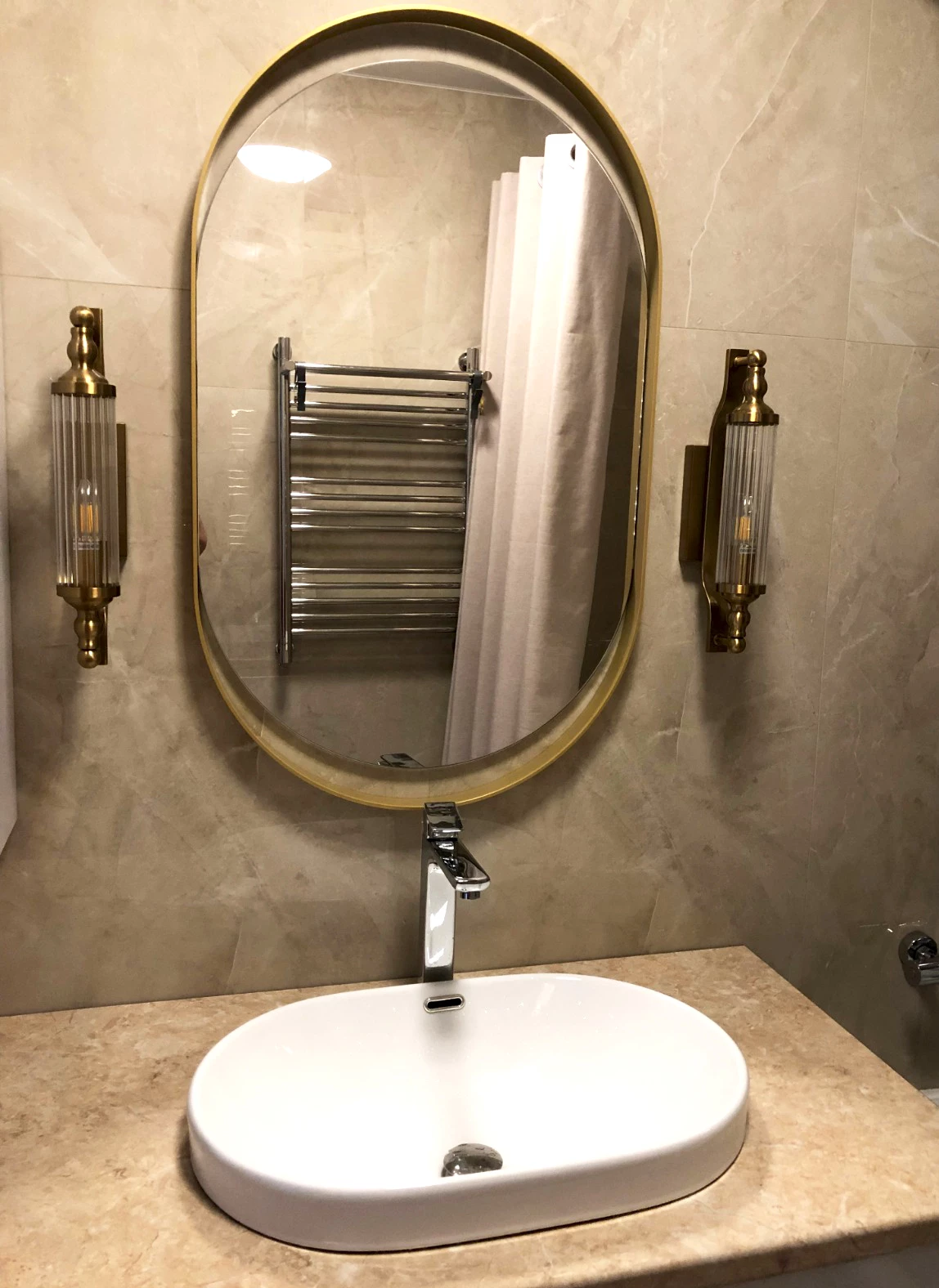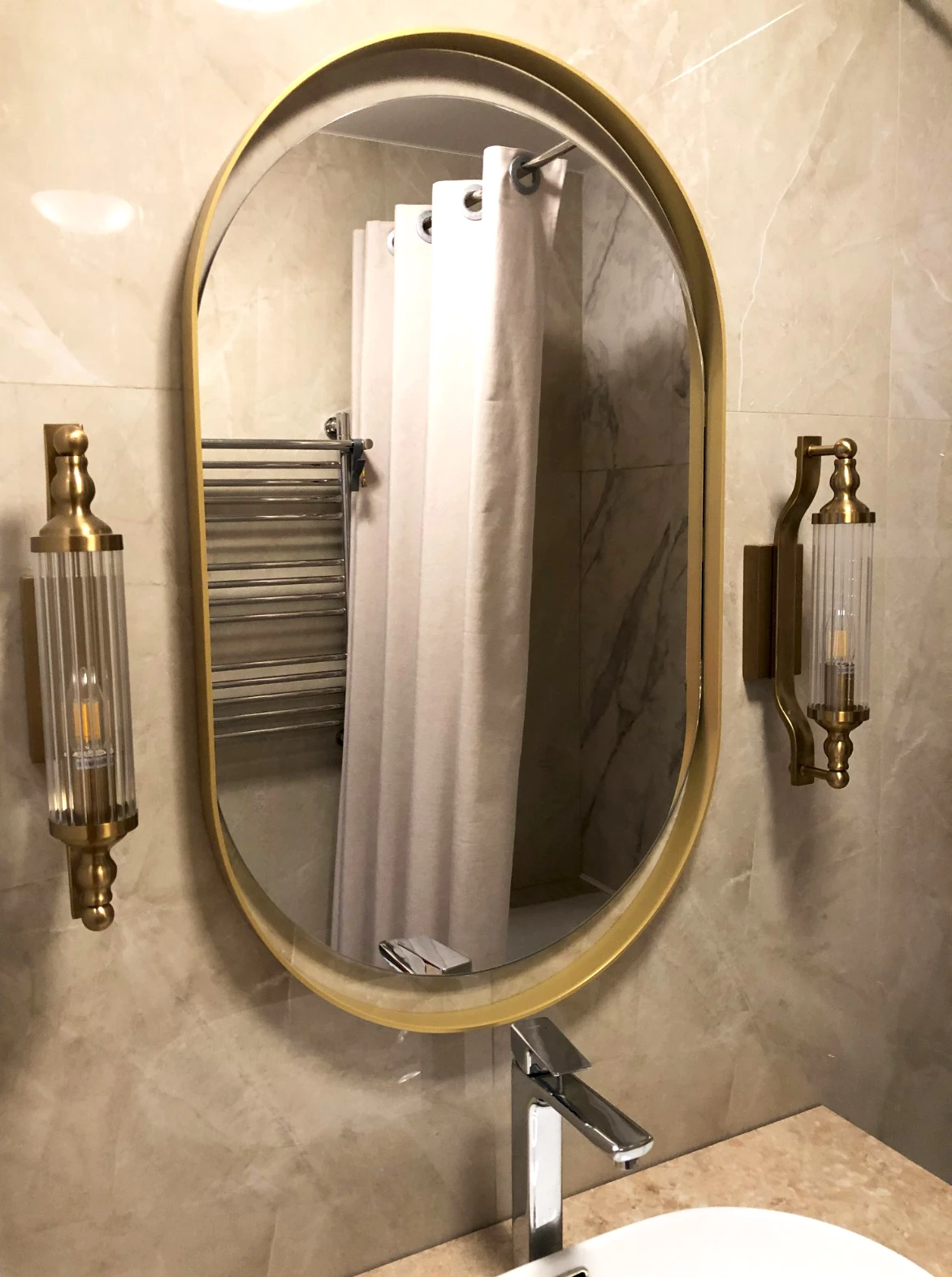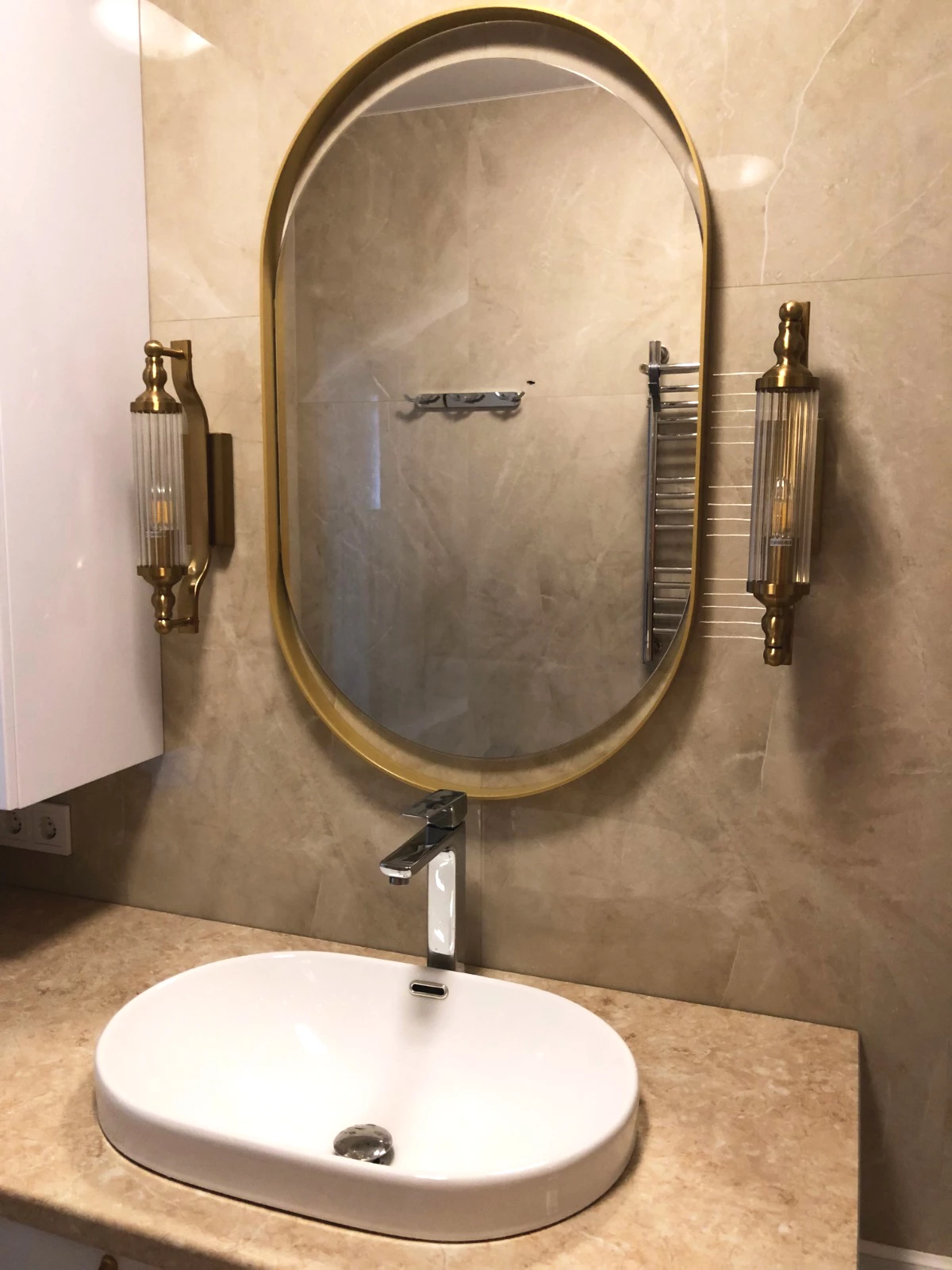 Фабрика добавила последний, но такой важный штрих – роскошное зеркало в ванную комнату. Оно стало центральным элементом интерьера, создавая атмосферу утонченной элегантности. Объемная металлическая золотая рама великолепно подчеркивает изящные изгибы зеркала. Любителя стиля «Лофт» точно оценят.