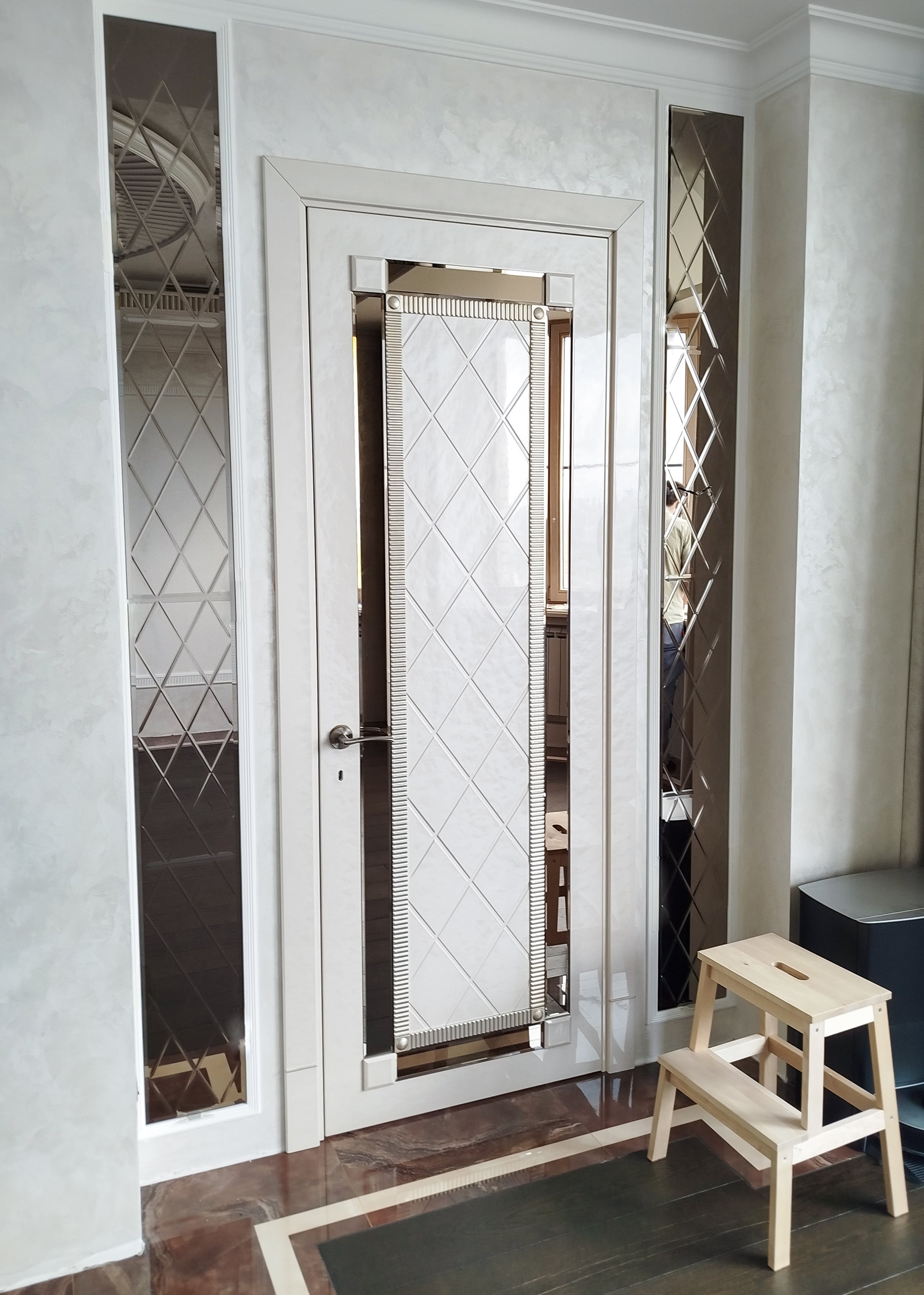 Зеркальное панно с фацетом строгой формы и ромбовидным узором. На двери также установлены элементы бевелс, которые создают непередаваемую игру света.